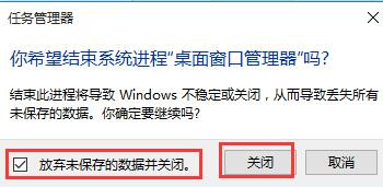 2、在任务管理器窗口中,点击“进程”选项,然后选择“桌面窗口管理器”,最后点击“结束任务”,如下图所示: