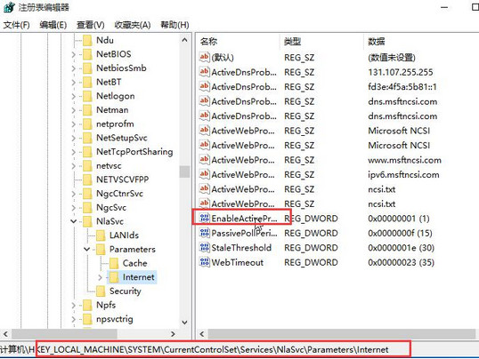 2、在注册表左侧依次展开:HKEY_LOCAL_MACHINE\SYSTEM\CurrentControlSet\Services\NlaSvc\Parameters \Internet,在右侧找到并打开EnableActiveProbing,如下图所示: