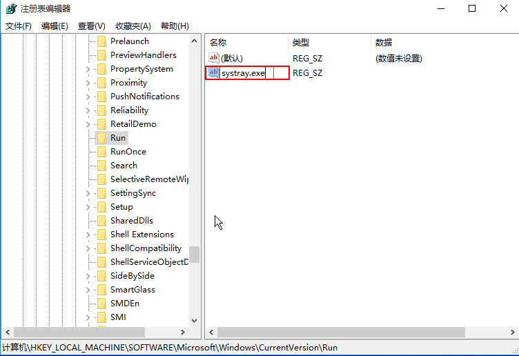 2、在打开的注册表编辑器中,依次展开“HKEY_LOCAL_MACHINE\SOFTWARE\Microsoft\Windows\CurrentVersion\Run”,在右侧窗口新建名为systray.exe的字符串值,如下图所示: