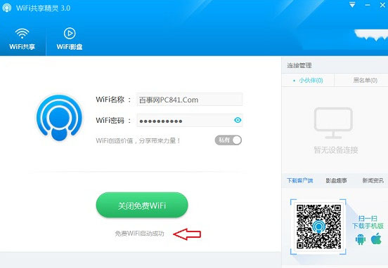 4、修改Wifi密码后,我们再选择开启免费Wifi,开启成功之后,Win10笔记本Wifi热点创建成功了,如下图所示: