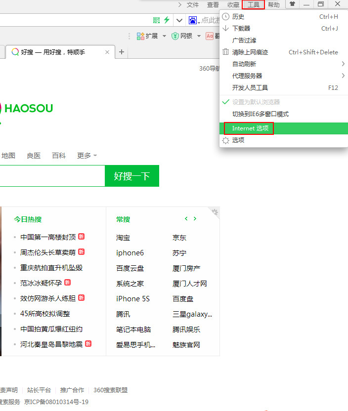 1、首先打开浏览器窗口,点击窗口上方的工具,然后选择internet选项,如下图所示: