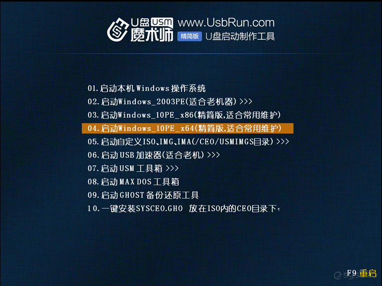 7、进入PE启动主菜单后,选择 04.启动windows_10PE_x64(精简版,适合常用维护) 进入PE;