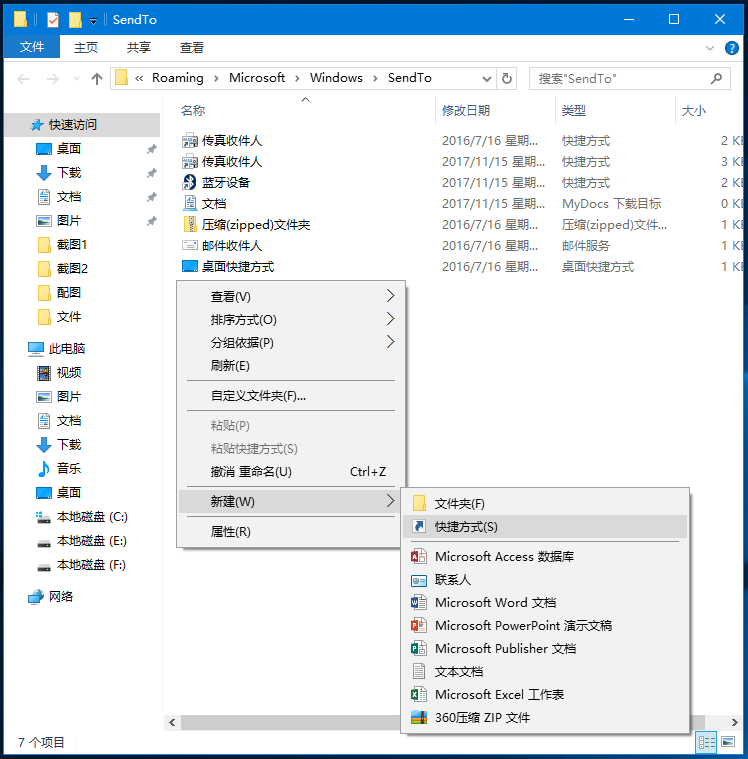 2、打开sendto文件夹,在空白处点击右键,选择新建一个快捷方式;