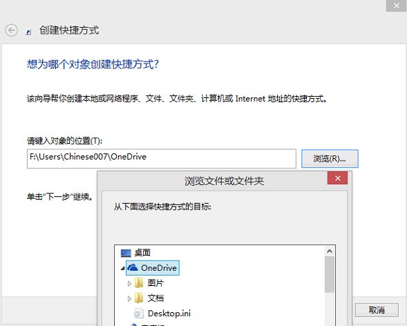3、在打开的“创建快捷方式”向导中按浏览选择OneDrive;